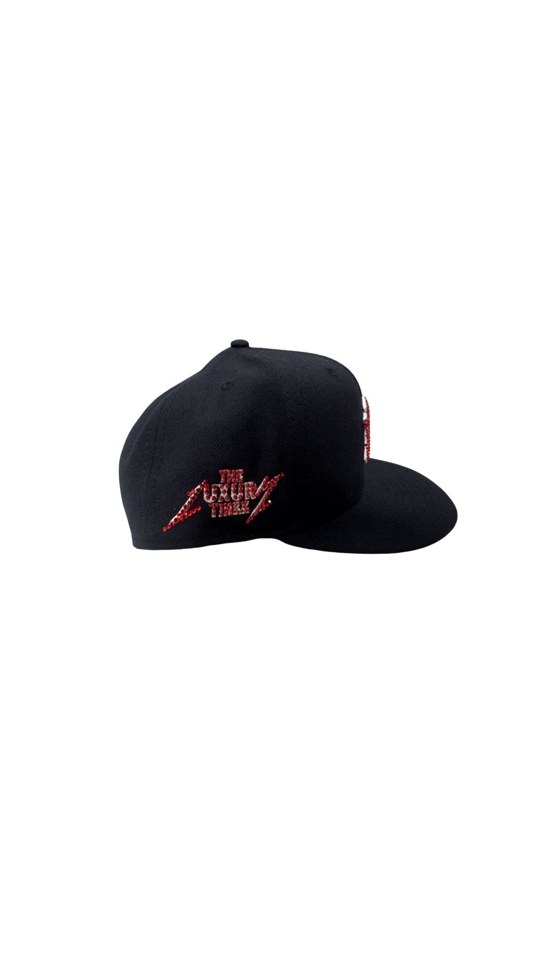 The Candy Apple Edition transforms a classic navy blue Yankee fitted into a luxury street statement. THELUXURYTIMES levels up the iconic look with handset candy apple red bezel stones that outline the logo in bold, diamond-like shine. Each stone reflects light with a glossy, candy coated pop giving the fitted a loud, high-end finish without losing that gritty NYC edge.